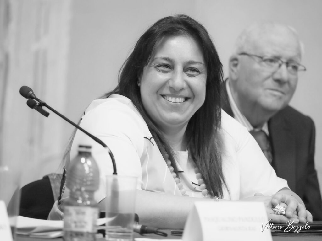 Cristina Malfarà Sacchini, Responsabile dell’Ufficio Confraternite della Diocesi di Mileto, Nicotera e Tropea. Alle spalle, Giuseppe Adilardi, già Priore della Confraternita dei Bianchi di San Nicola, co-organizzatrice dell’incontro di Tropea.
